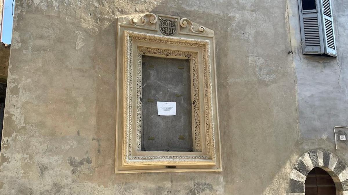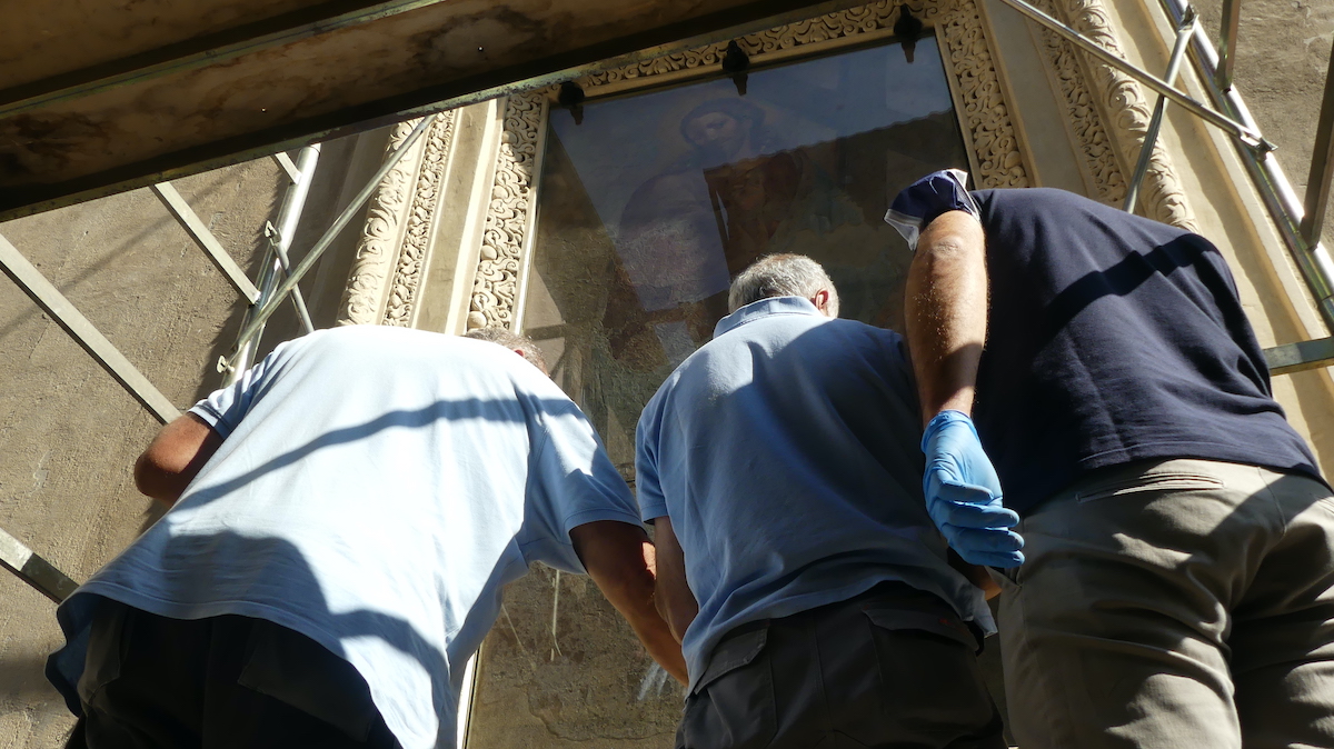 L’edicola con l’affresco raffigurante il “Cristo che porta la Croce” è tornata completamente pulita, restaurata anche nella sua cornice. I lavori sono stati commissionati all’Opera del Duomo alla Keo e sono stati eseguiti da Giuseppe Ammendola e Chiara Munzi che ci hanno brevemente spiegato cosa e come hanno svolto la delicata e preziosa opera di restauro.