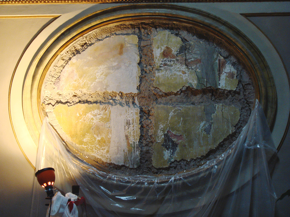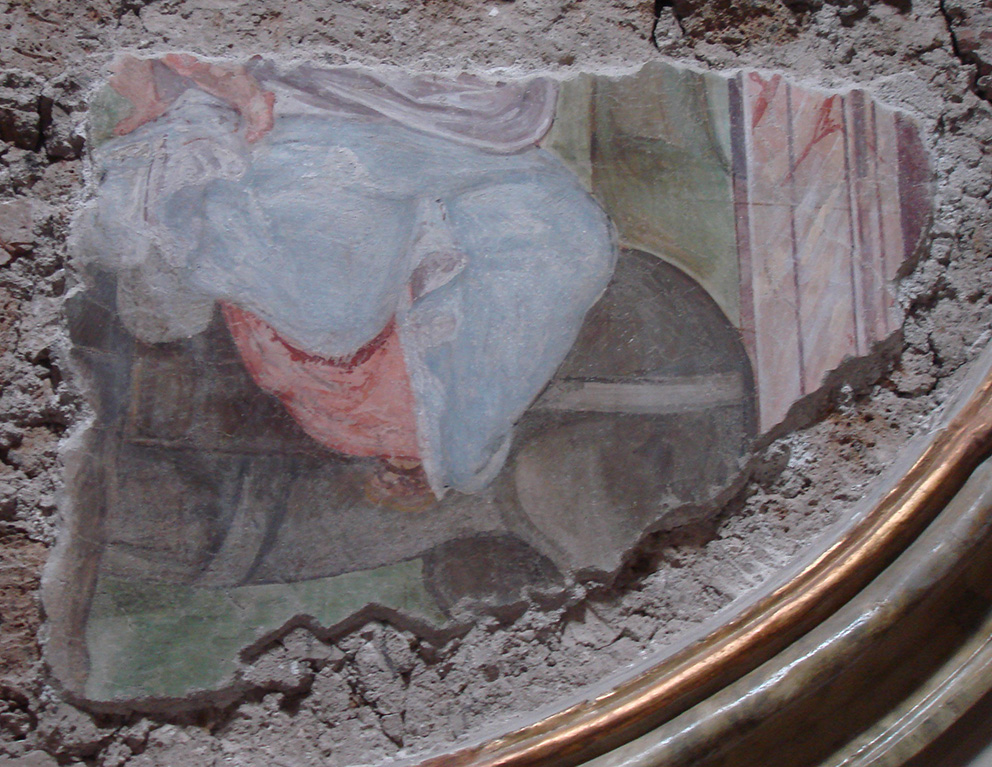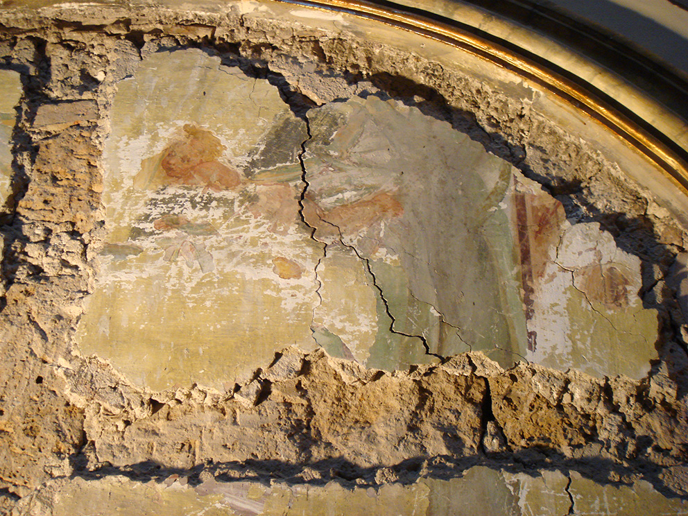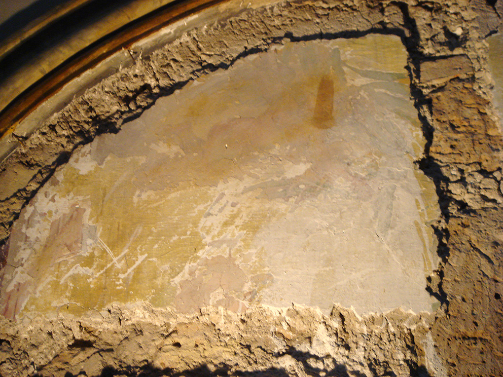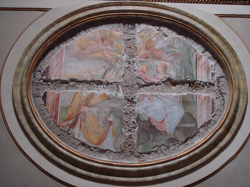 Il dipinto mostrava come chi ha “riammodernato” la cappella abbia deciso di non eliminare completamente l’opera ma di far spazio al telaio della tela appesa poi sopra, facendo un profondo scasso, eliminando tutti gli strati di intonaco fino alla struttura muraria. In questo modo si è generata una lacuna del supporto del dipinto a forma di croce. La superficie pittorica che ne rimaneva è stata, poi, ricoperta da uno scialbo giallo.