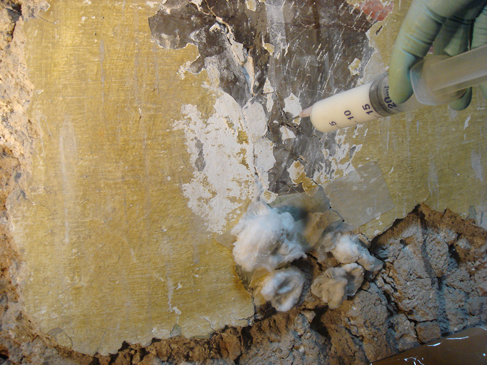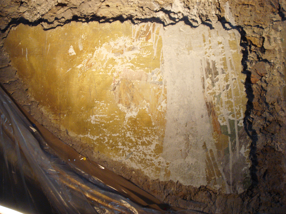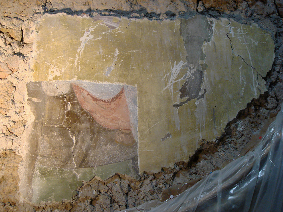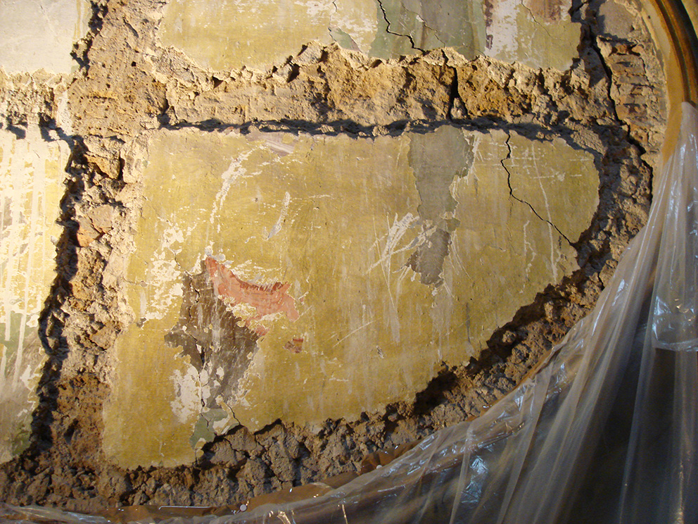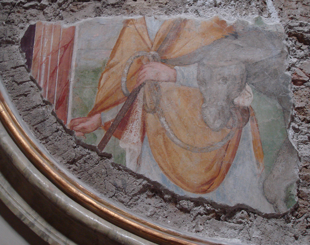Il dipinto mostrava come chi ha “riammodernato” la cappella abbia deciso di non eliminare completamente l’opera ma di far spazio al telaio della tela appesa poi sopra, facendo un profondo scasso, eliminando tutti gli strati di intonaco fino alla struttura muraria. In questo modo si è generata una lacuna del supporto del dipinto a forma di croce. La superficie pittorica che ne rimaneva è stata, poi, ricoperta da uno scialbo giallo.
