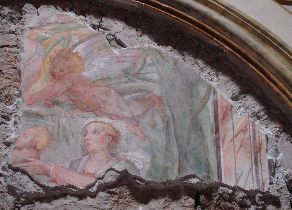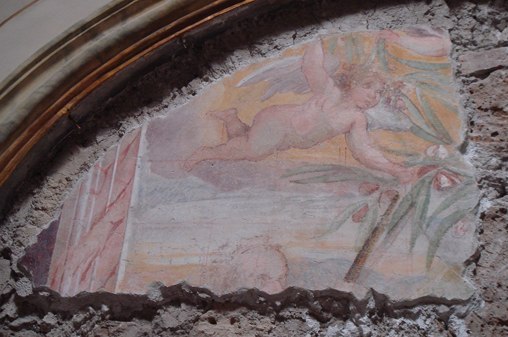 La revisione stilistica della cappella avvenuta nel XVII secolo ha ricoperto una decorazione precedente: sotto ad una tela ovale, delimitata da una cornice in stucco, è stato riscoperto un brano pittorico a fresco, con finiture a secco, raffigurante “la fuga in Egitto”.