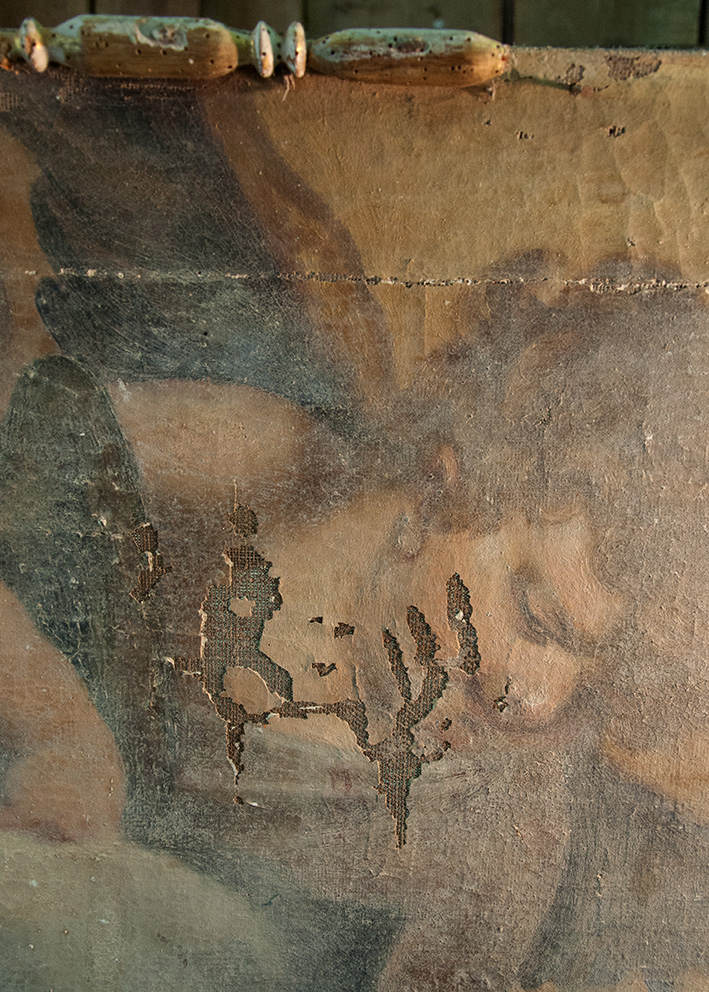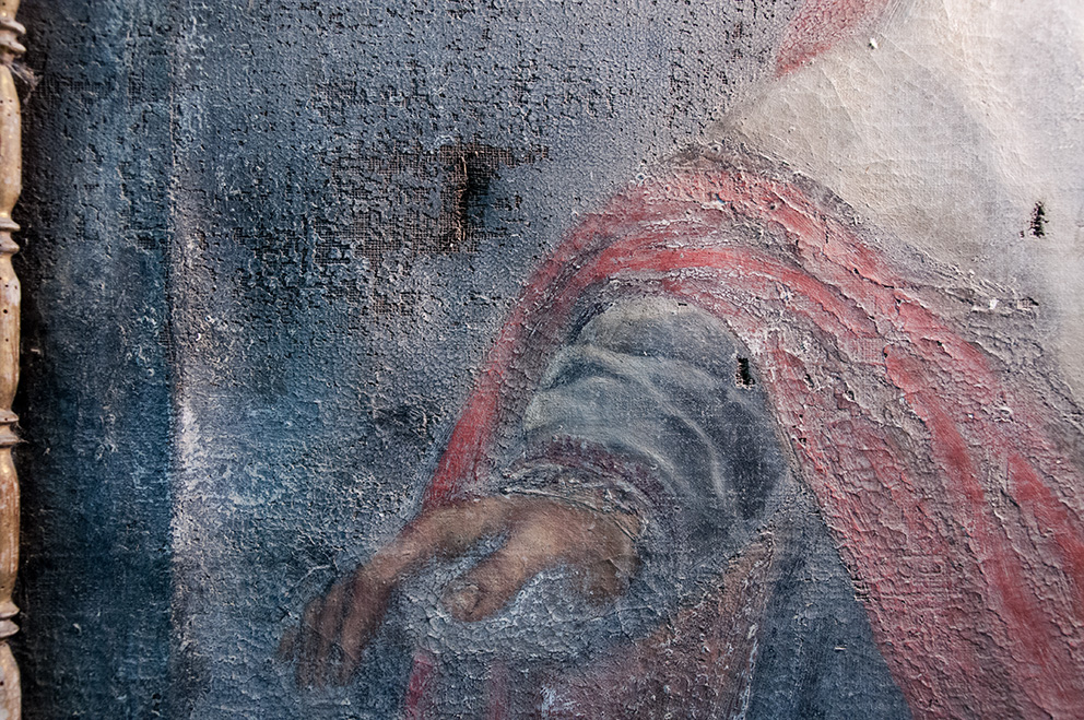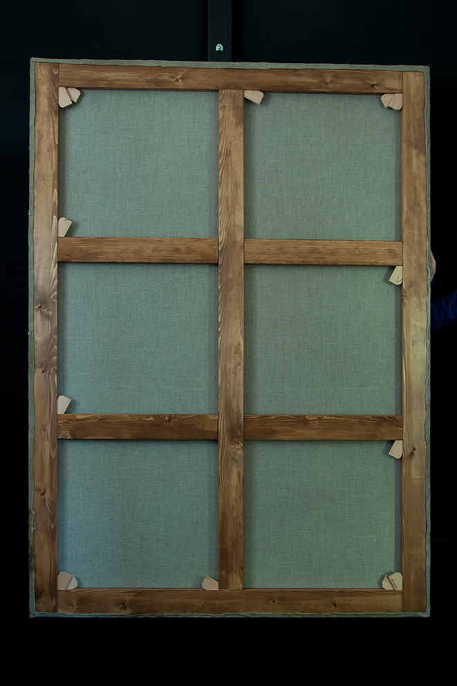 - la perdita di planarità e le deformazioni del supporto, dovute sia al microclima dell’ ambiente nel quale è collocata l’opera sia all’inefficacia della funzione di tensionamento del vecchio telaio;