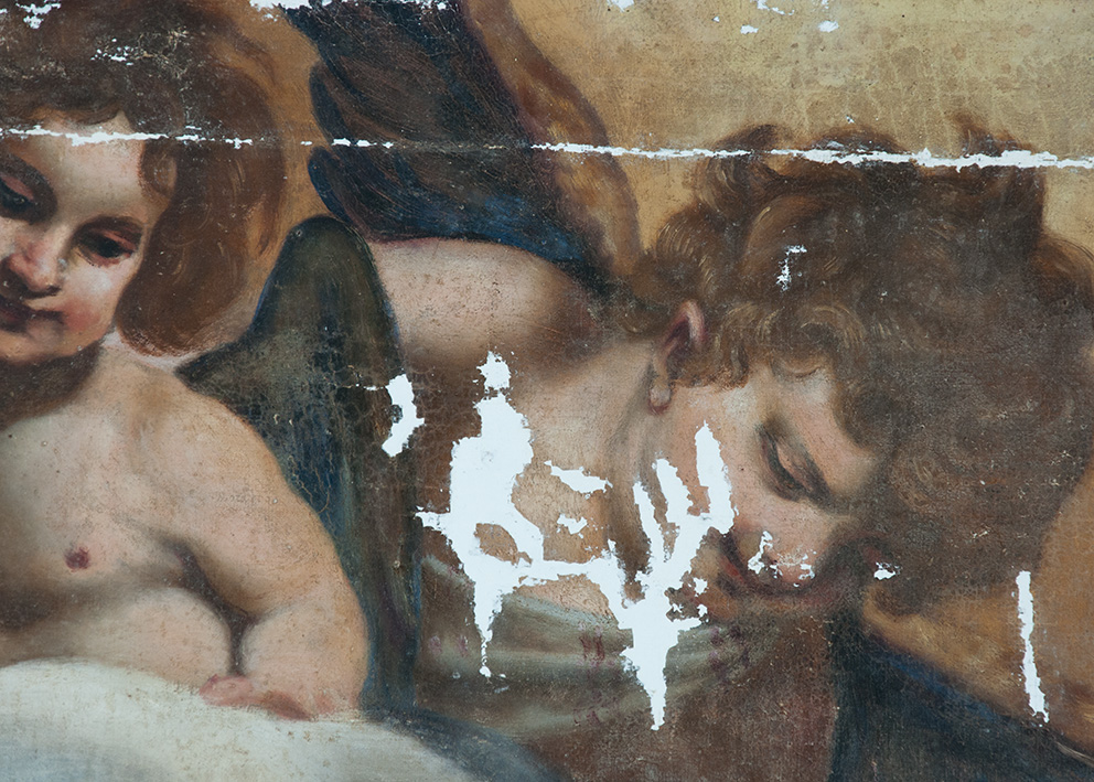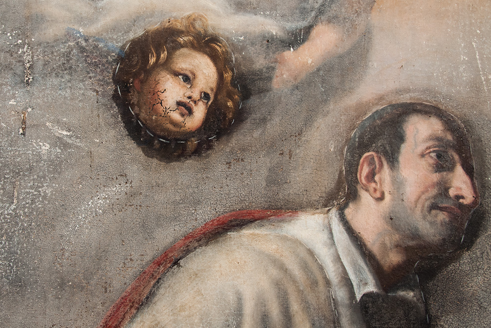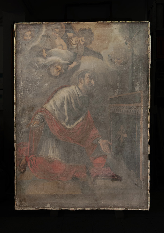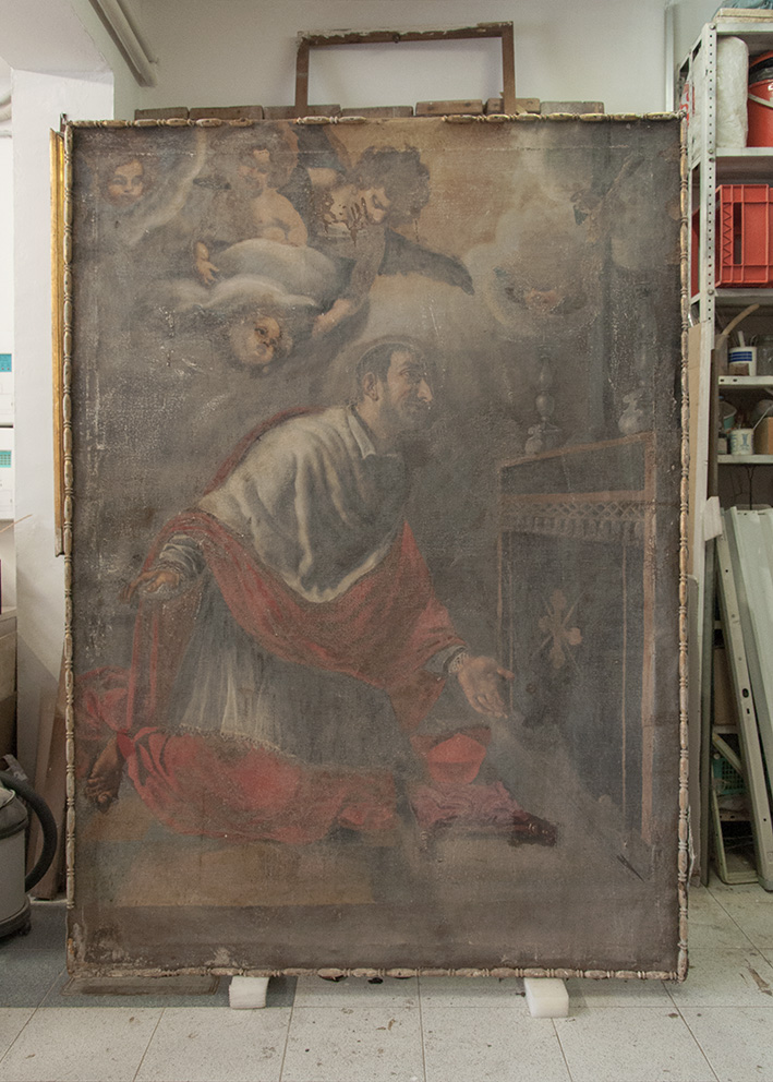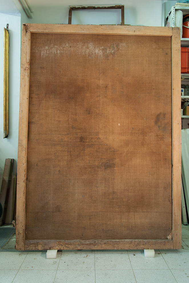 L’opera necessitava con urgenza di un intervento di restauro, il quale è iniziato con una parziale pulitura per eliminare i depositi superficiali più spessi. Operazioni di fondamentale importanza sono state: il consolidamento della tela originale, il risarcimento delle lacune del supporto, la foderatura totale ed il ritensionamento su nuovo telaio.