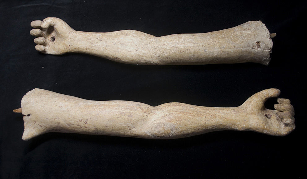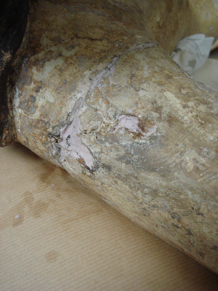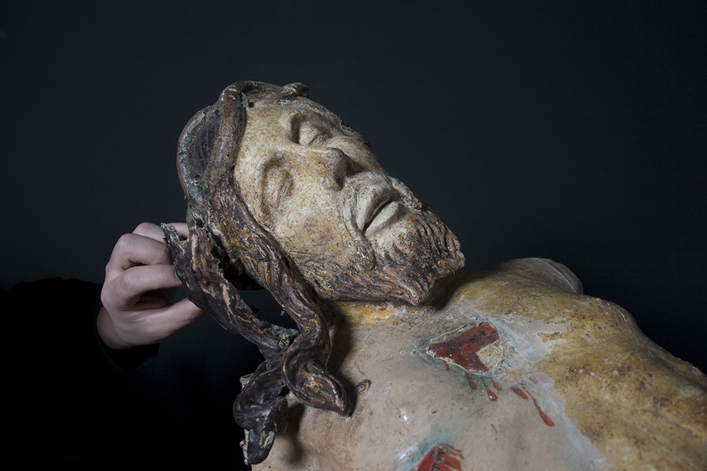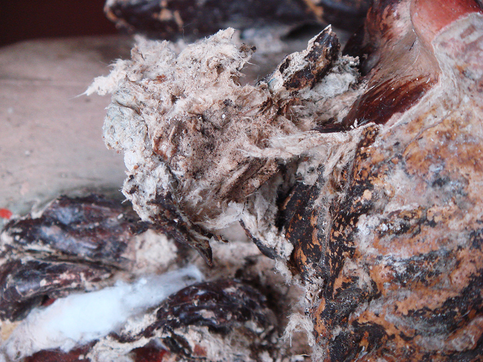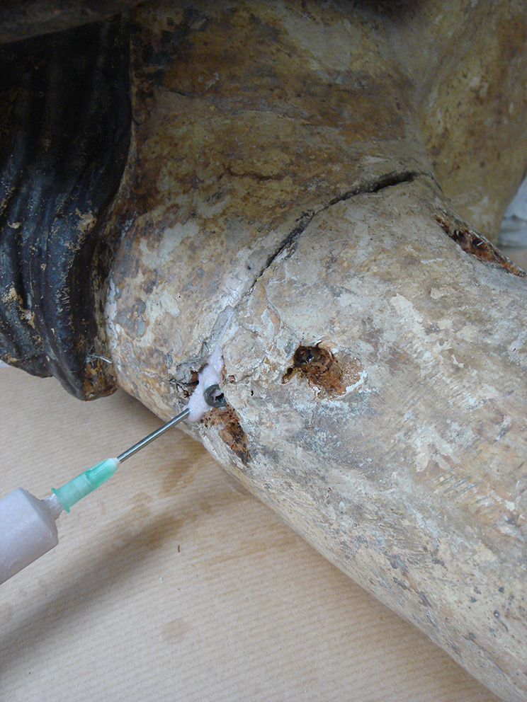 L’incollaggio delle braccia, che si presentavano completamente distaccate dal resto del corpo, è avvenuto tramite l’uso di colla forte, mentre per le stuccature del legno è stata usata la Balsite.