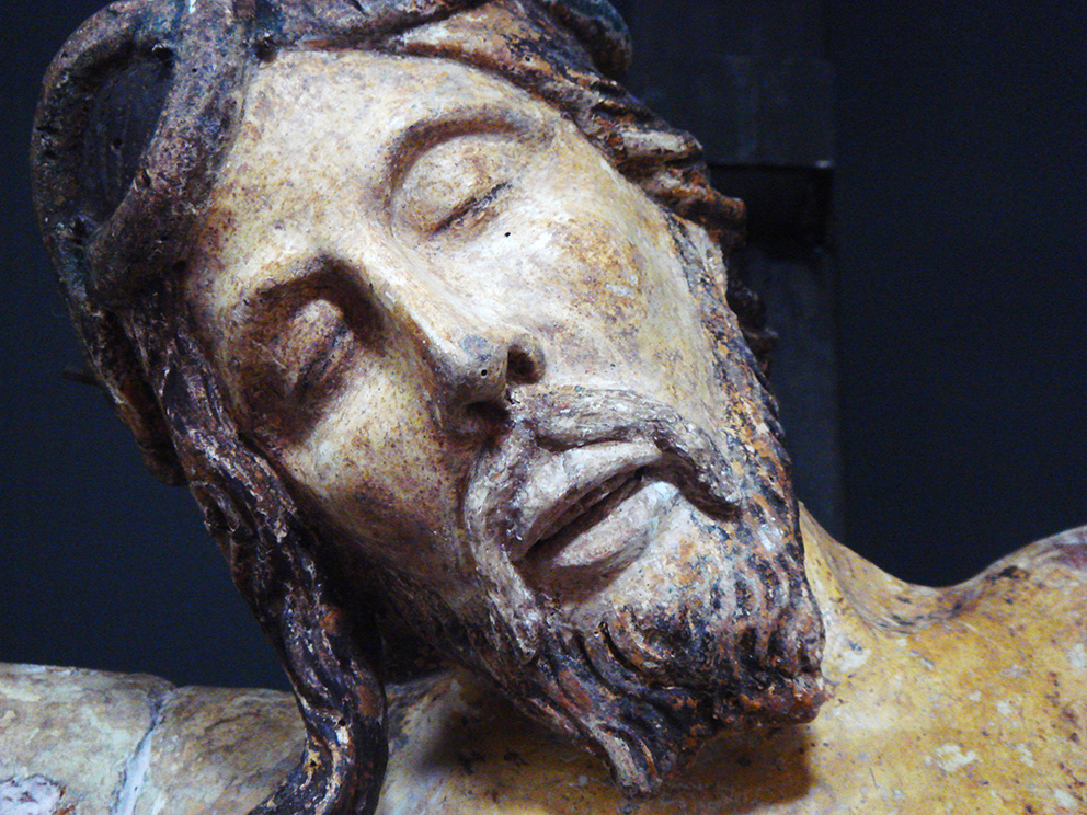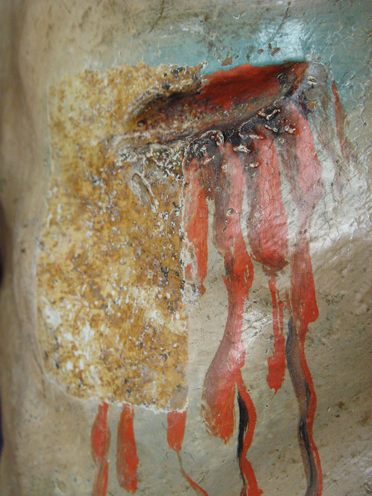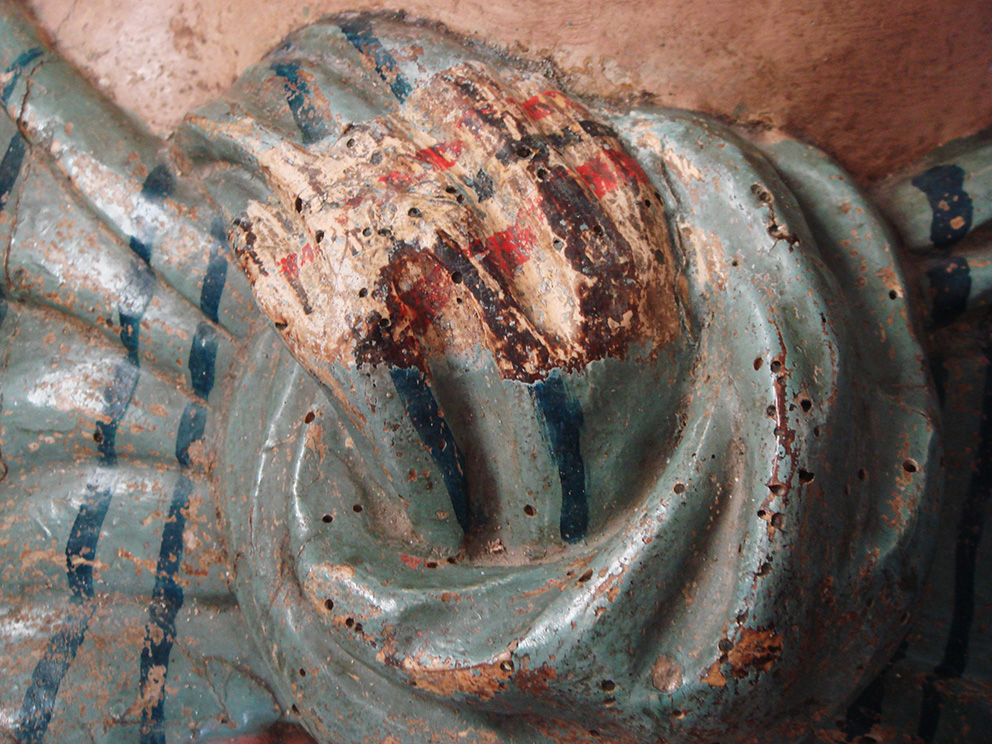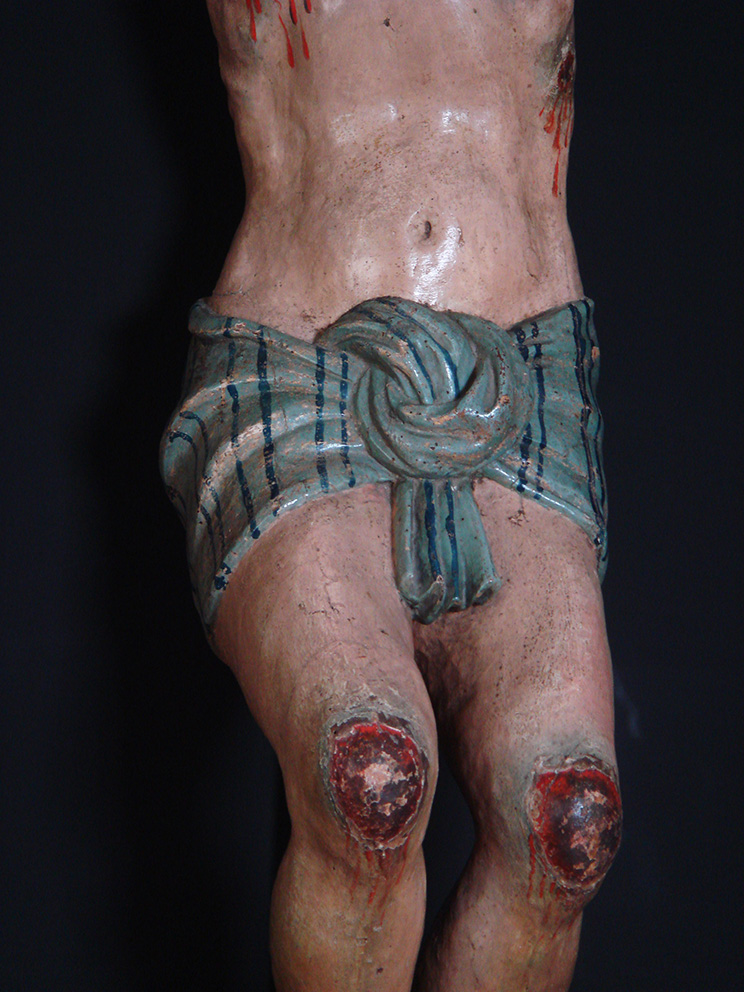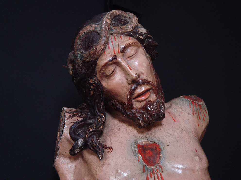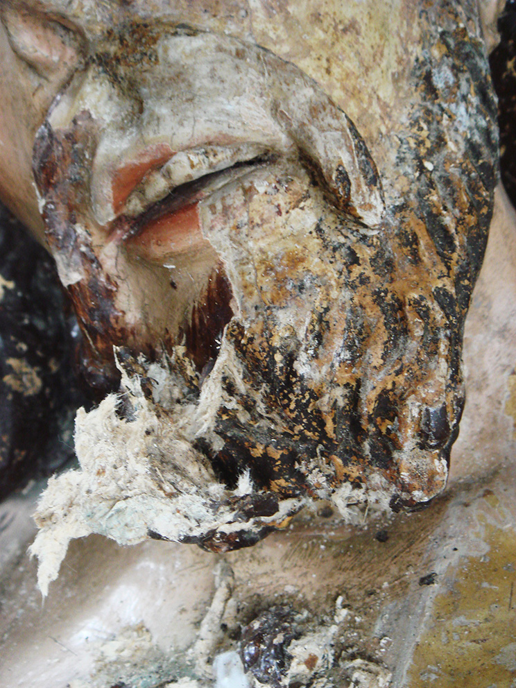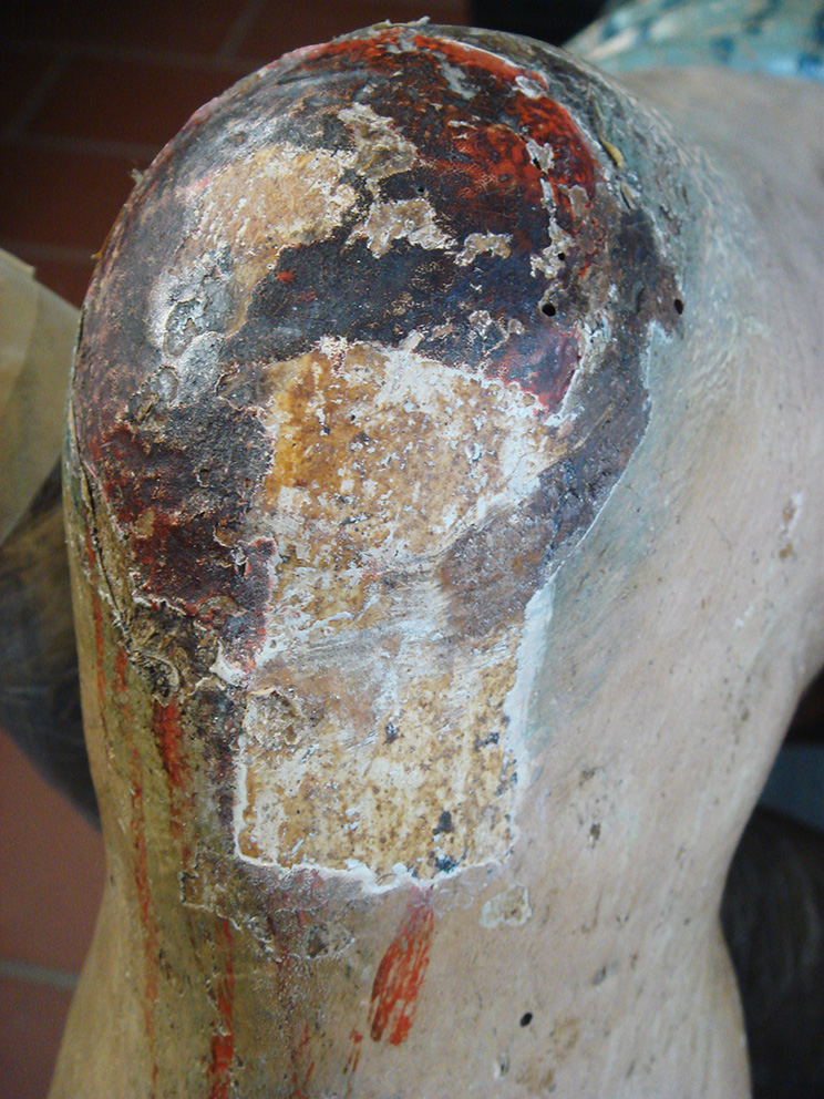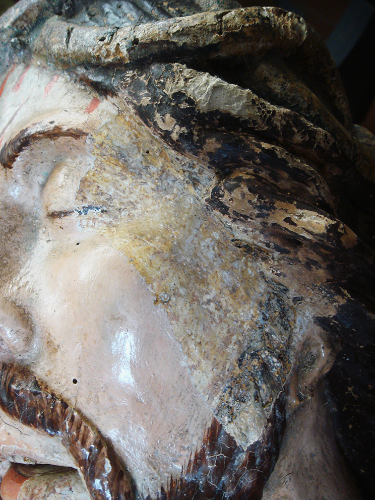 Una spessa ridipintura settecentesca ricopriva completamente la cromìa originaria cinquecentesca. La scultura aveva subìto una vera e propria rivisitazione stilistica, frutto del cambiamento di gusto dell’epoca. Tra i vari rifacimenti e aggiunte da sottolineare l’innesto di una nuova barba e di ciocche di capelli in cartapesta. A seguito dei test di pulitura, si è riscontrata una stesura pittorica cinquecentesca, seppure abrasa, in un buono stato conservativo.